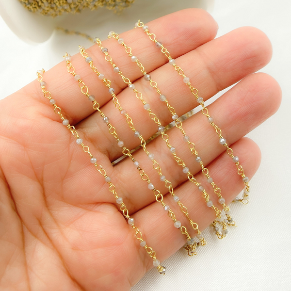 Coated Blue Moonstone Gold Plated 925 Sterling Silver Wire Chain. Stone Size: 2mm 2.5mm (the sizes are approximate). Number of Stones per Foot: 47-49 approx. Sold by foot.