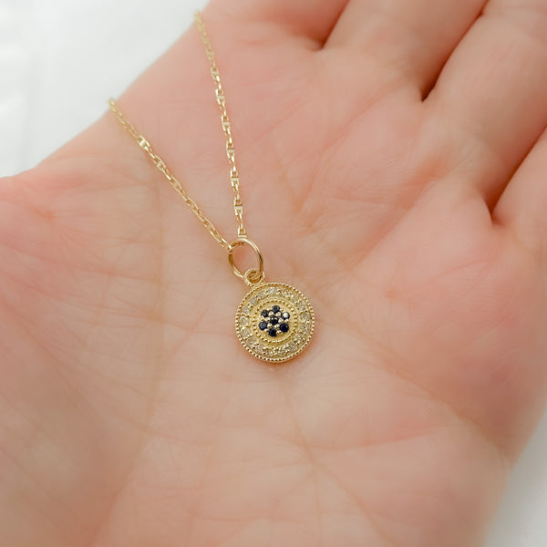 14k Solid Gold Diamond and Blue Sapphire Circle Charm. Size: 9mm. Sold by Piece. GRS WT: 0.773 - DIA WT: 0.12 - ST. WT: 0.065.