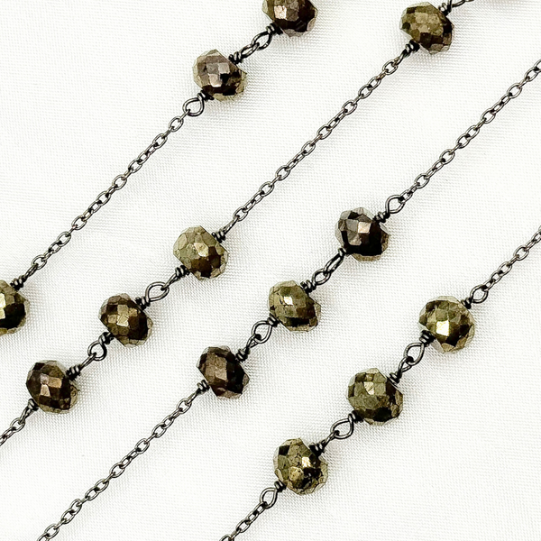 Pyrite Oxidized 925 Sterling Silver Connected Wire Chain. Stone Size: 5x7mm (the sizes are approximate). Number of Stones per Foot: 15 approx. Sold by Foot.