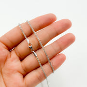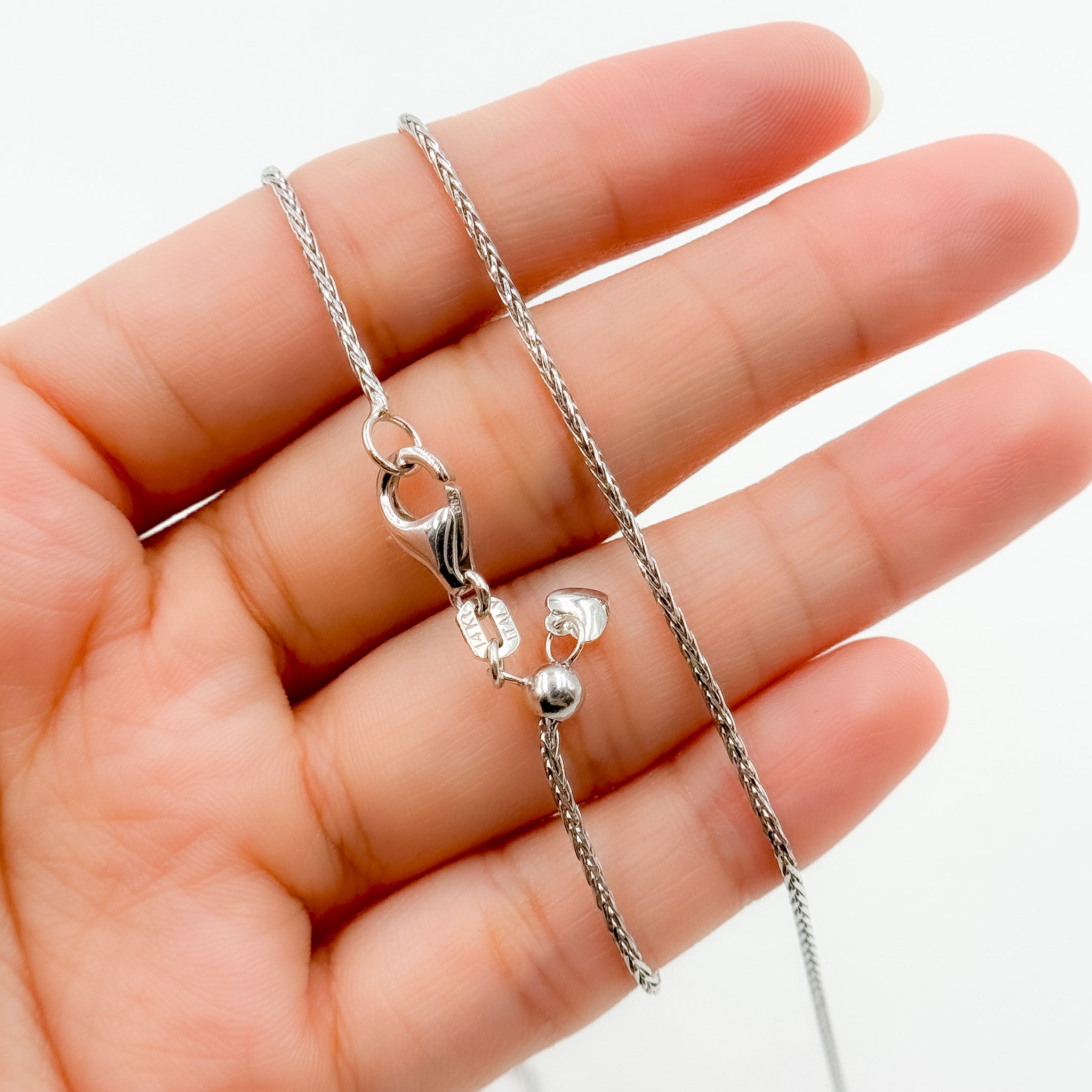 The white gold box chain features square links with geometric precision. The uniform structure prevents pendant twisting, making this the best white gold chain option for displaying charms and pendants.