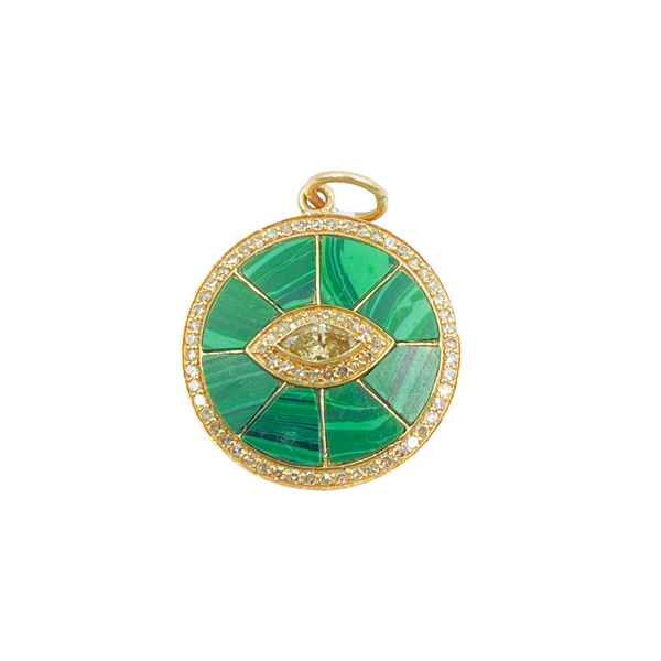 14K Solid Gold Circle Charm with Evil Eye in the center. Available in Malachite. Size:23mm. Thickness: 4mm.